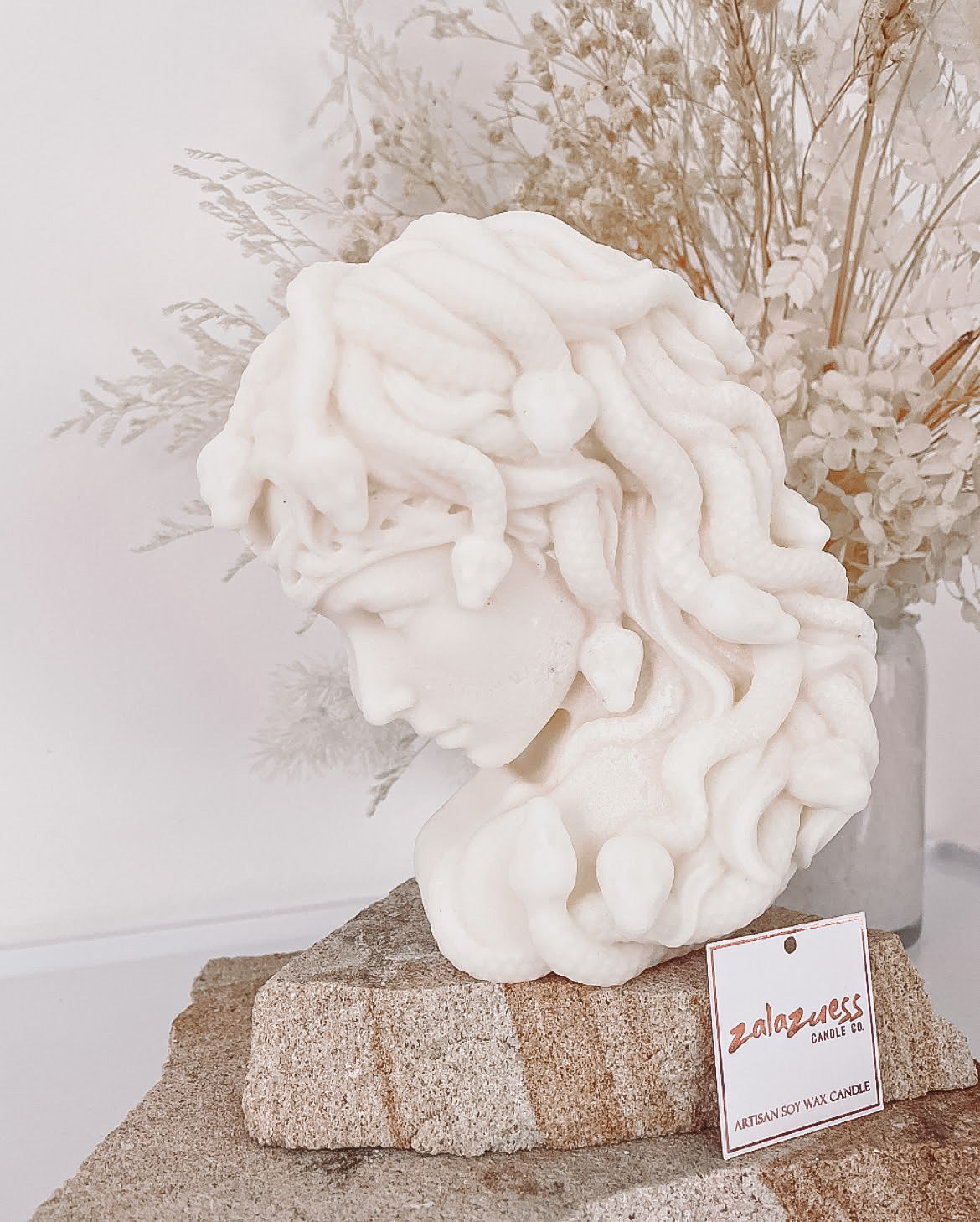 Medusa comes unscented in natural soy wax with a cotton wick.